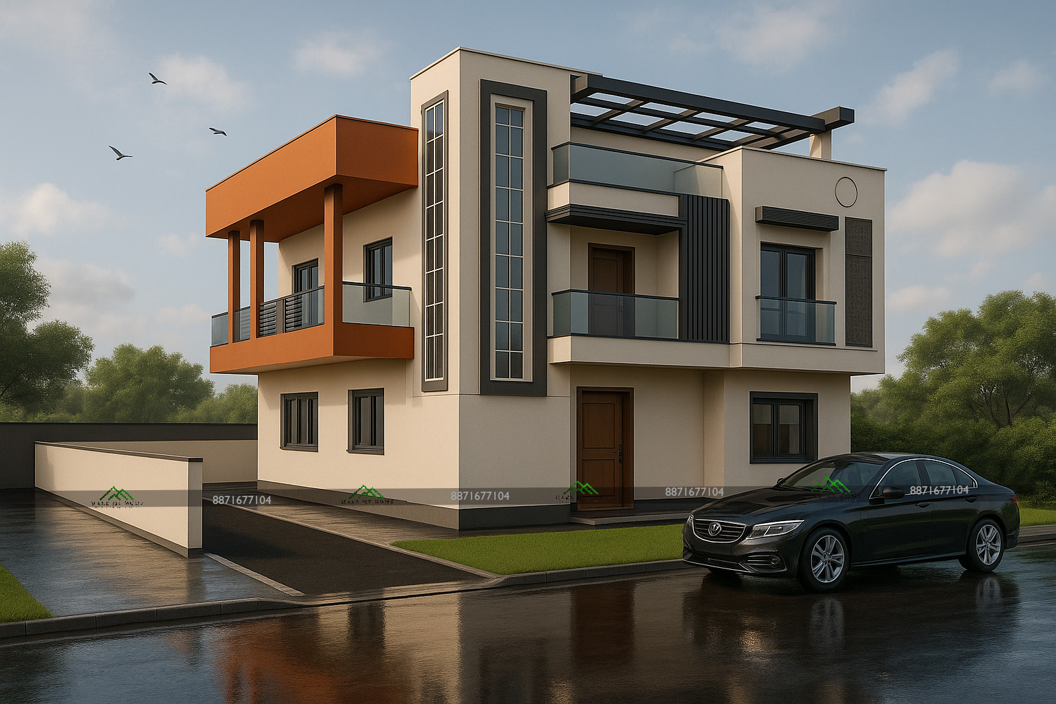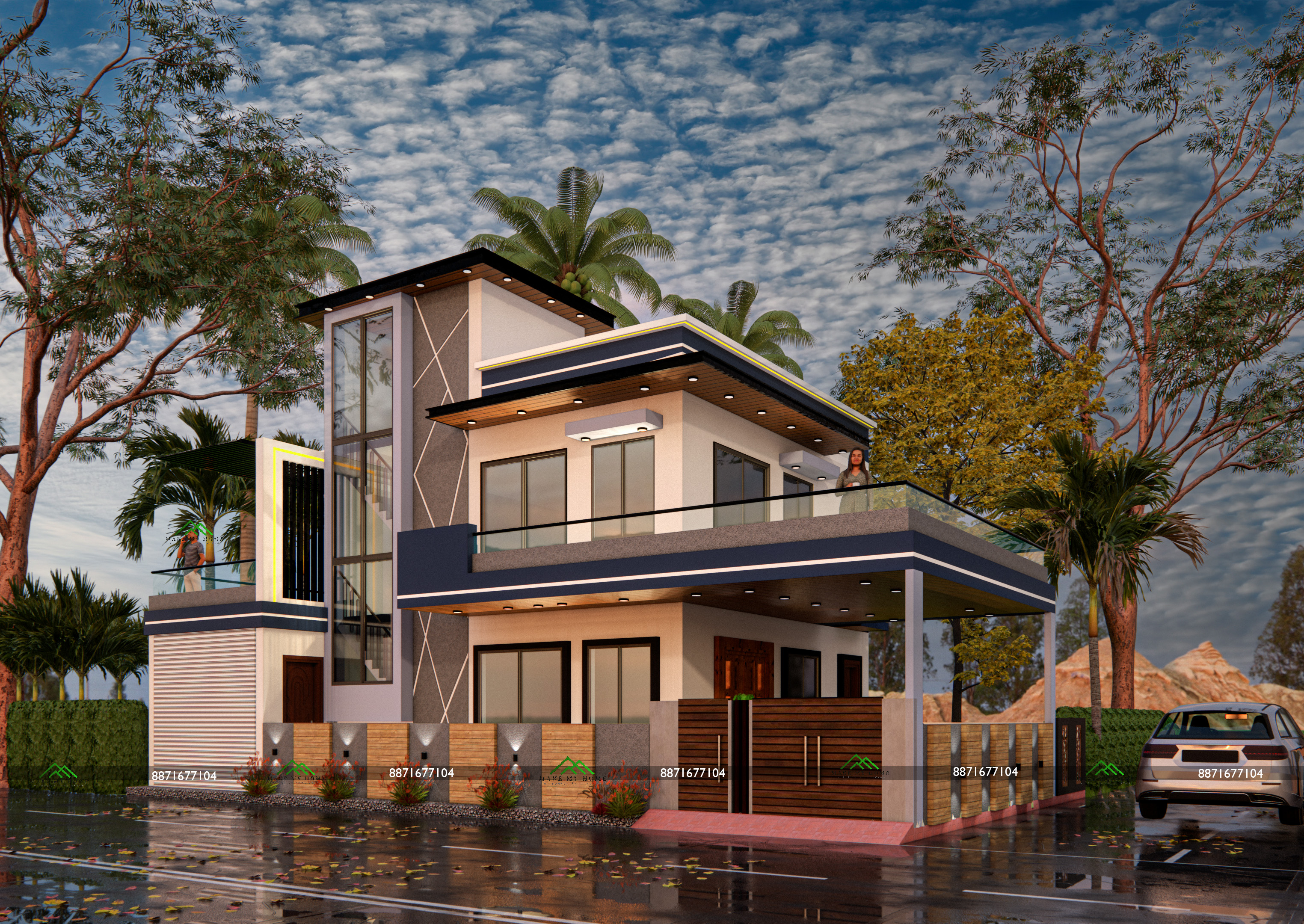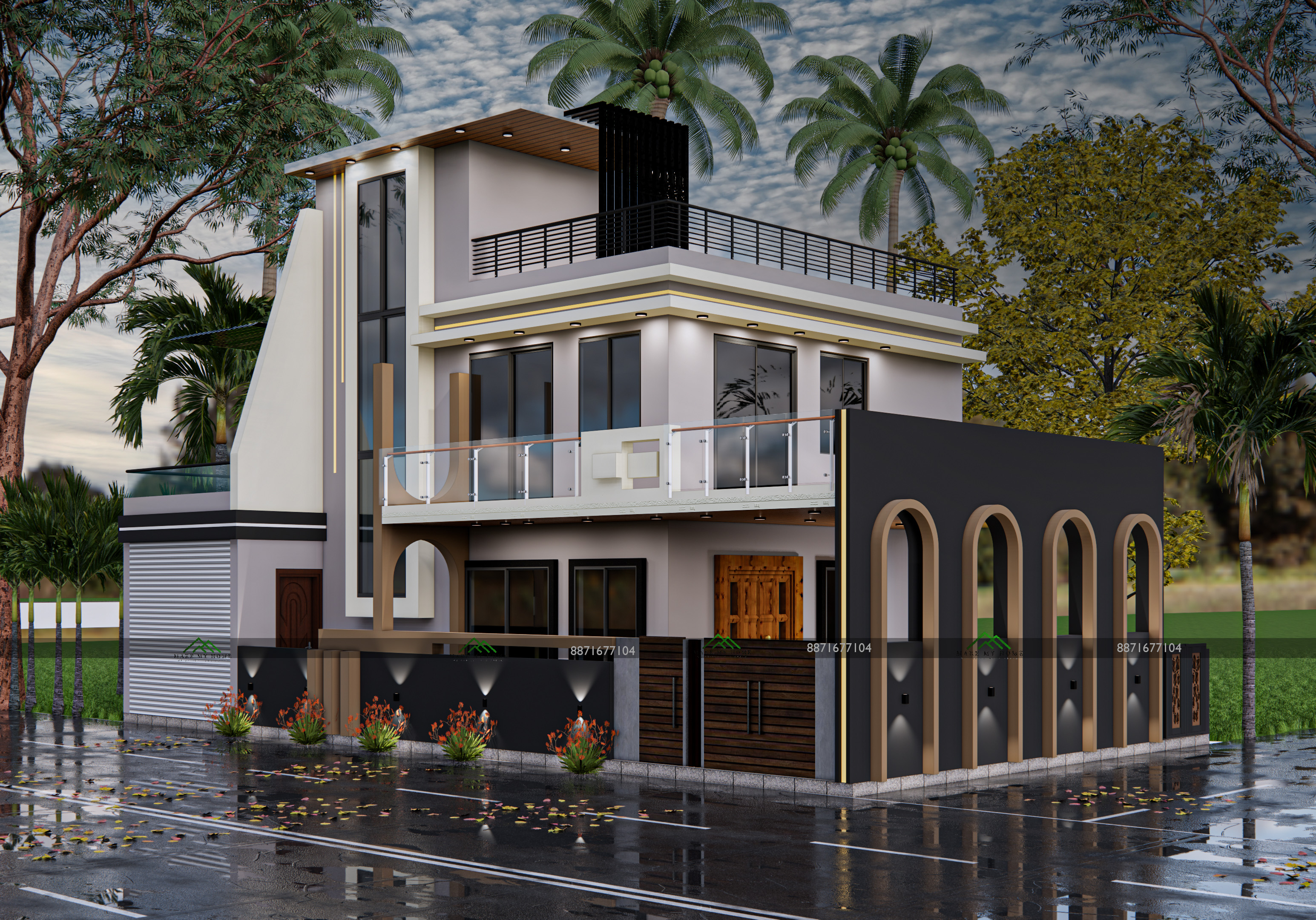 3D Elevation Design: A 3D elevation shows the external view of a building from one side — front, rear, or side — with realistic detailing. It helps visualize the structure’s style, material, and proportions before construction begins.